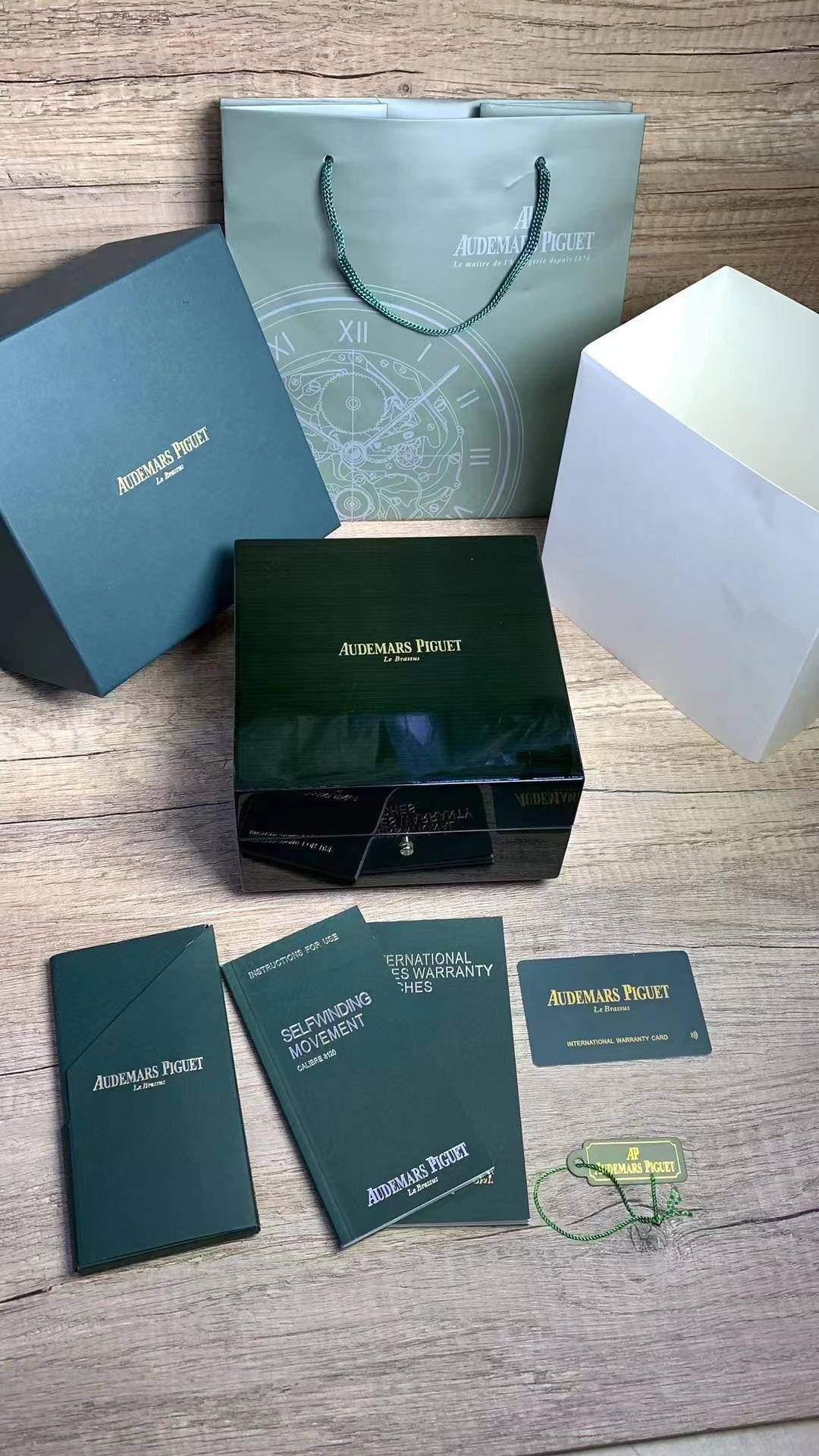 Note: As is standard with high-quality replicas, this elegant box design is universal across all Audemars Piguet models, and the warranty card is provided without a specific model code for authenticity and consistency.